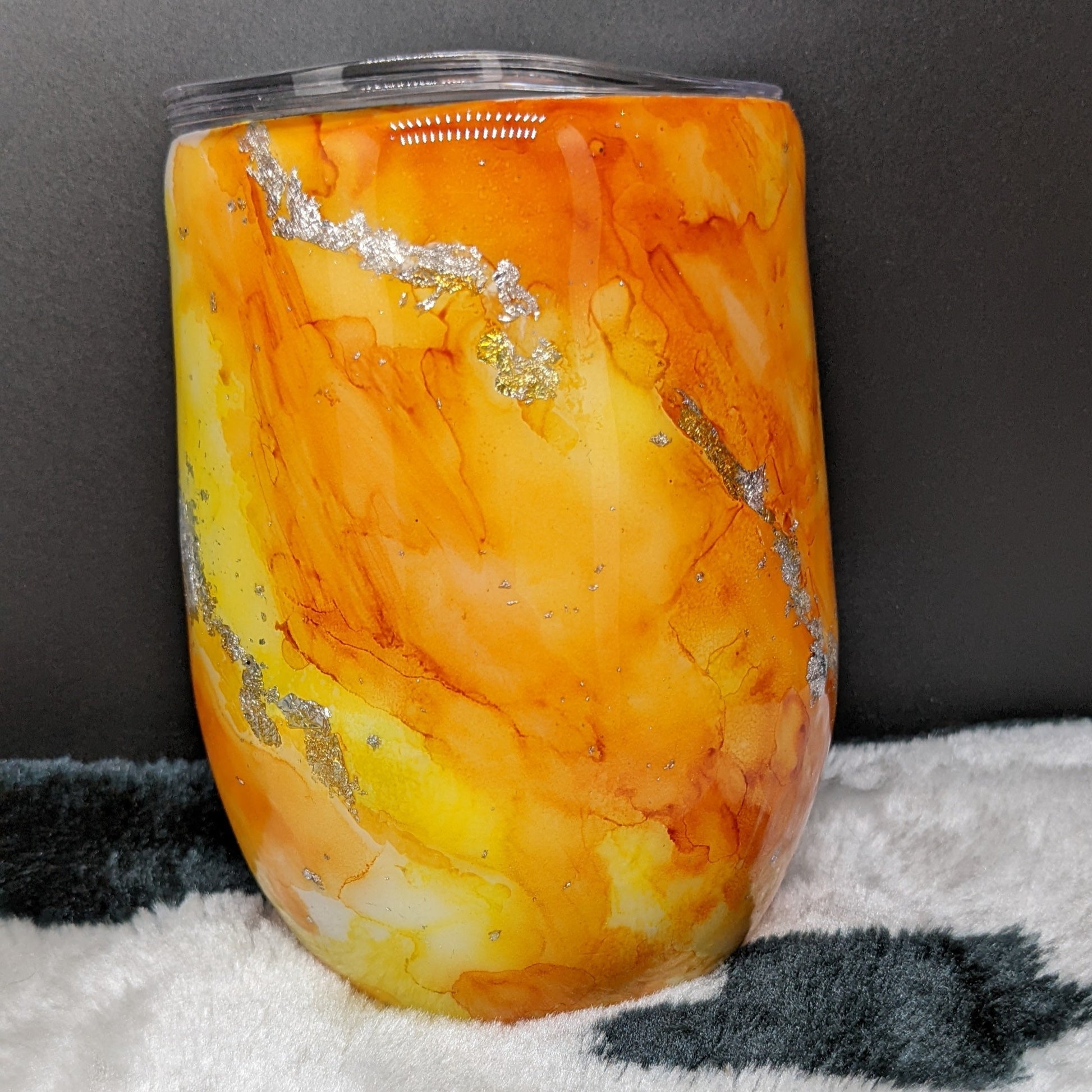 12 oz stainless steel double insulated orange epoxy wine tumbler. Will keep your drink hot or cold for an extended amount of time.