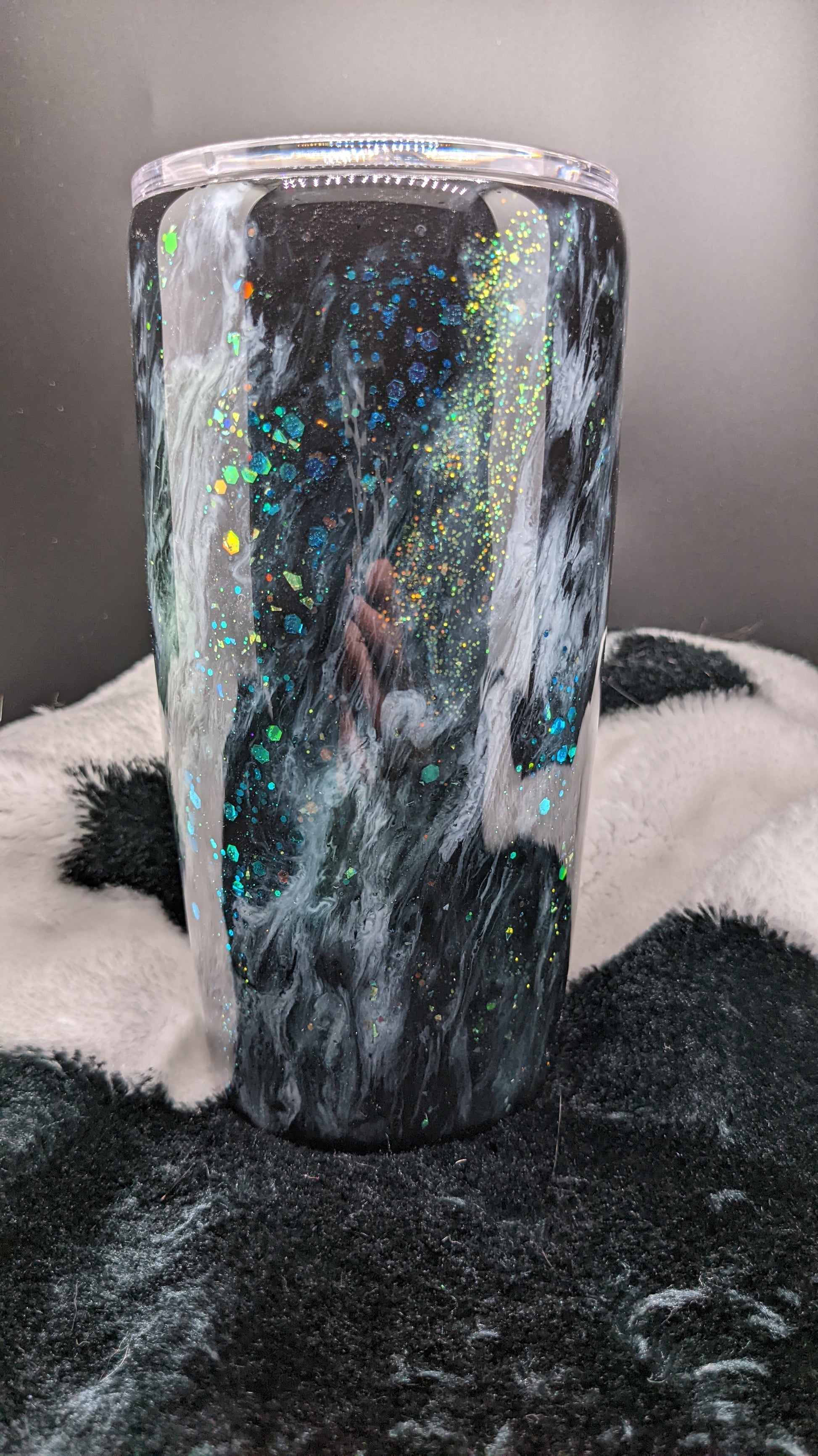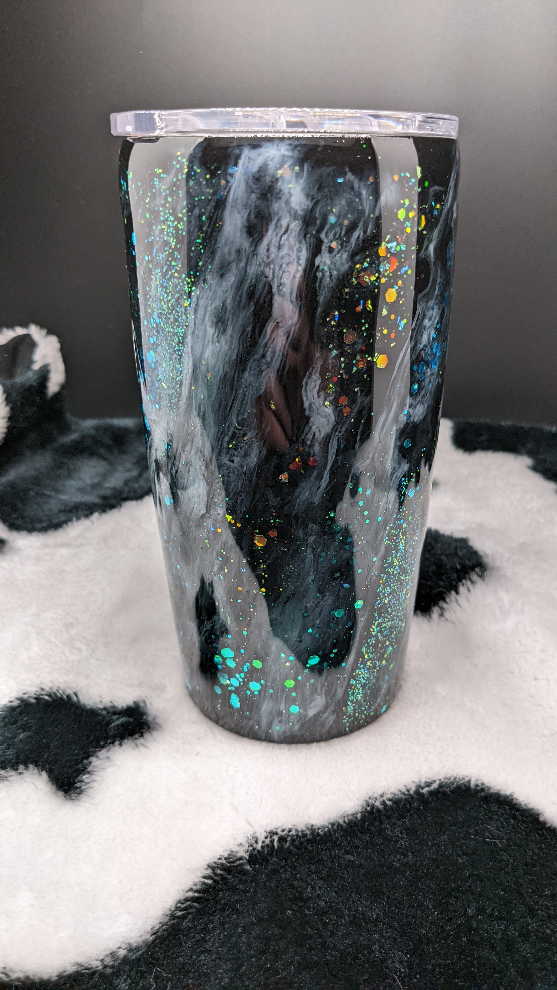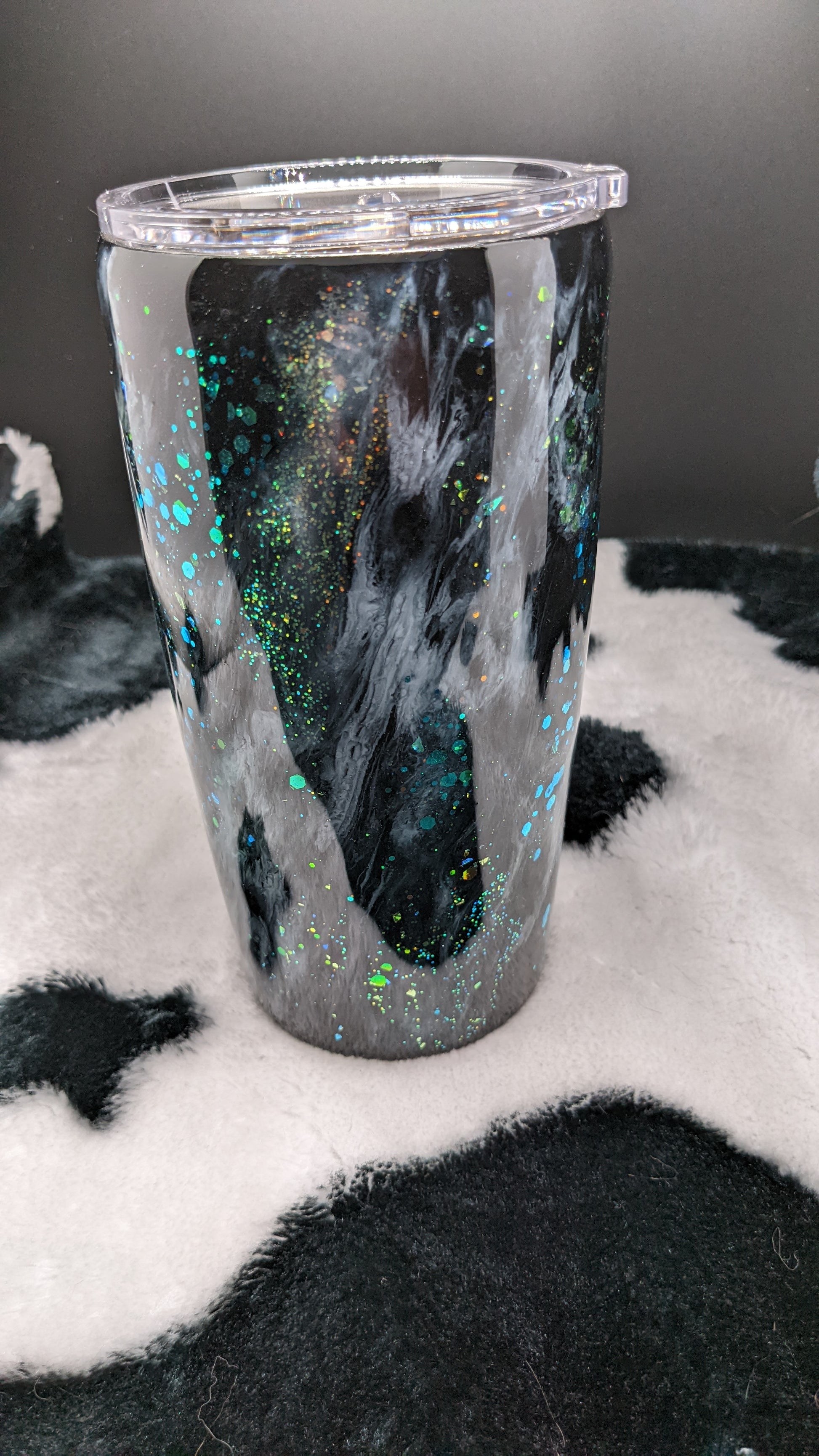 20 oz double insulated black white silver and gold milky way swirl. Will keep drinks hot or cold for an extended amount of time.
