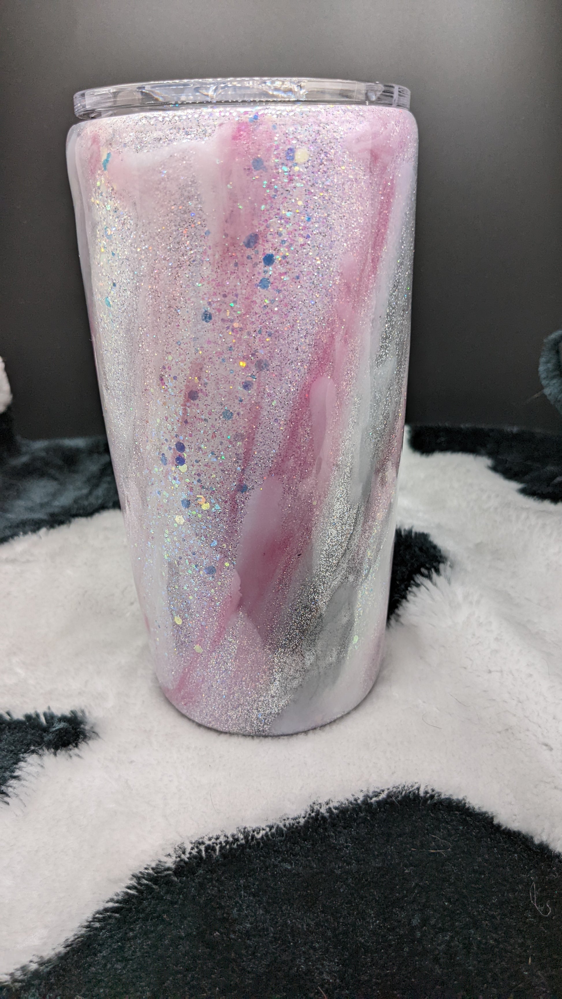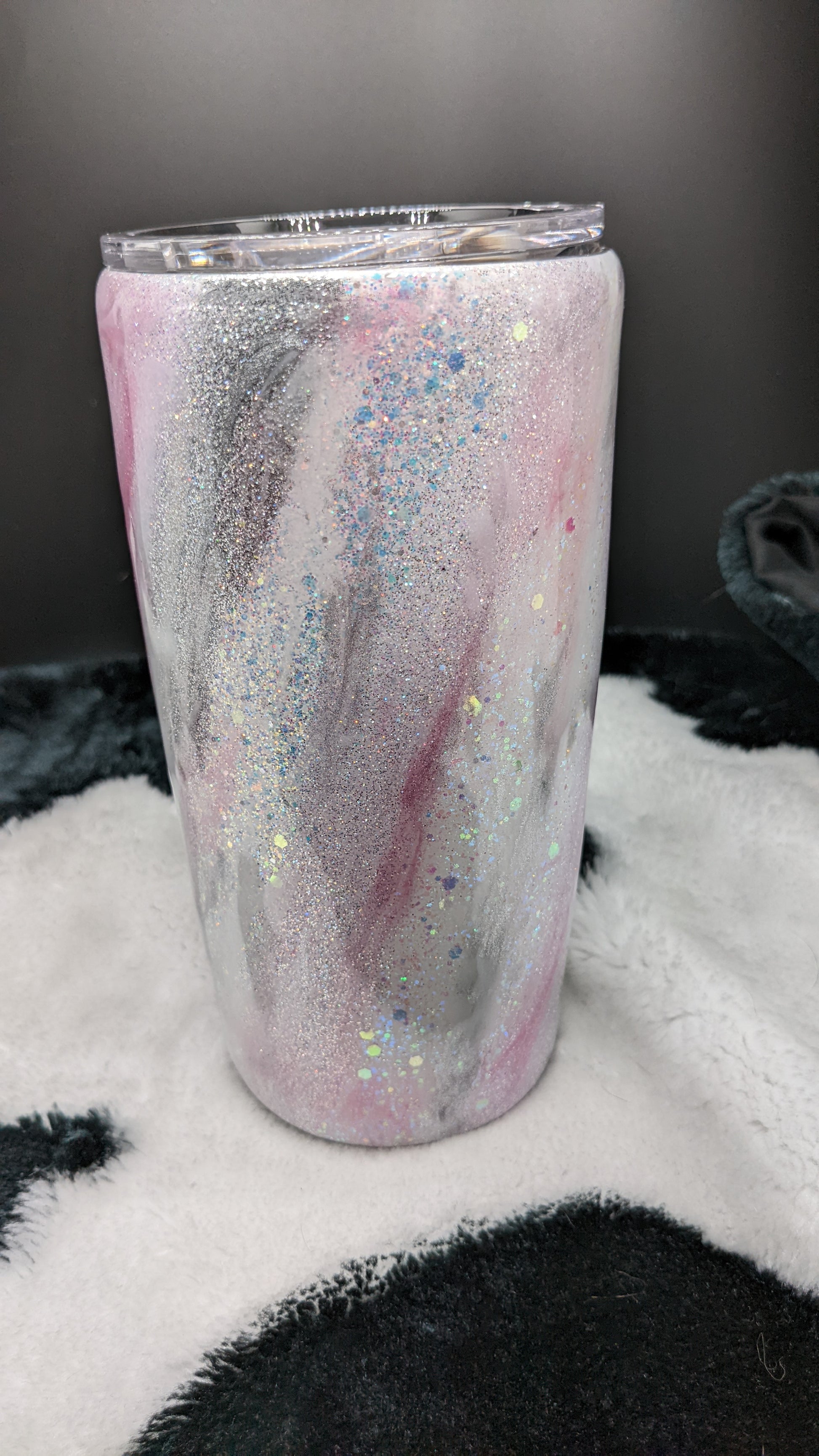 20 oz double insulated pink silver and white milky way swirl. Will keep drinks hot or cold for an extended amount of time.