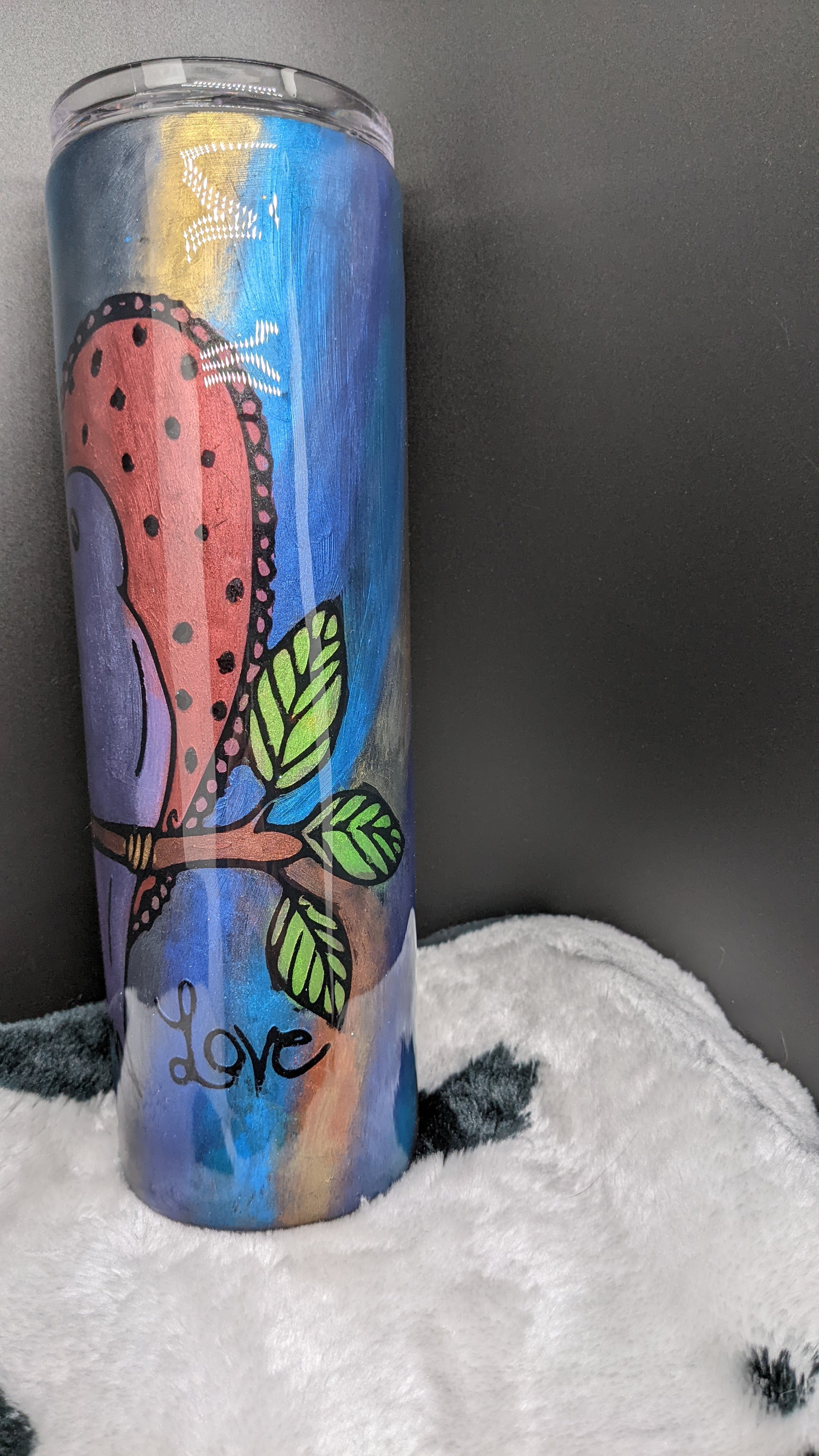 30 oz love birds. Stainless steel double insulated epoxy tumbler. Will keep drink hot or cold for extended time.