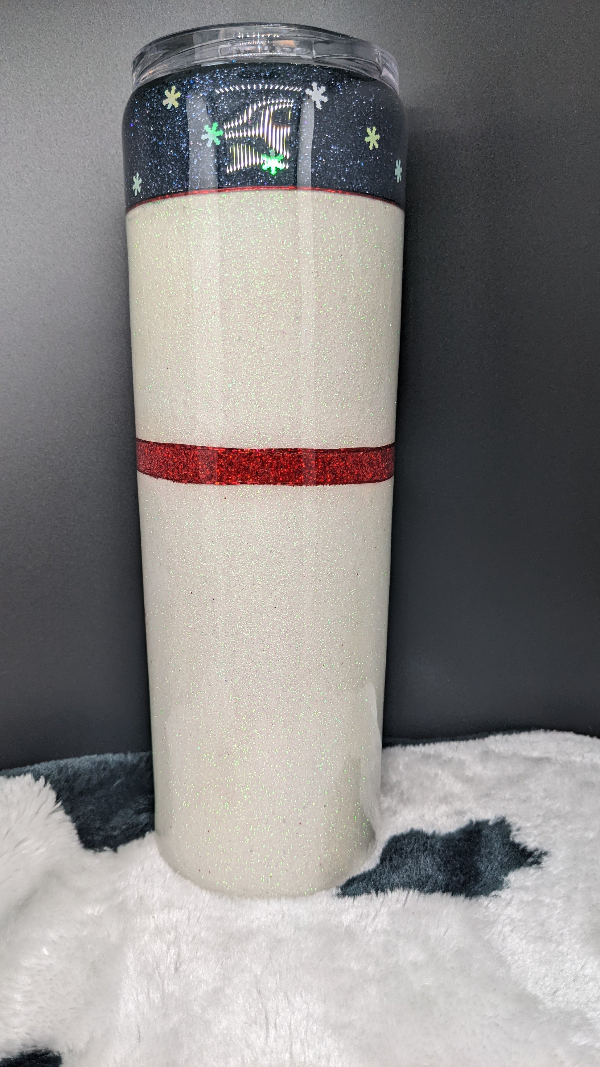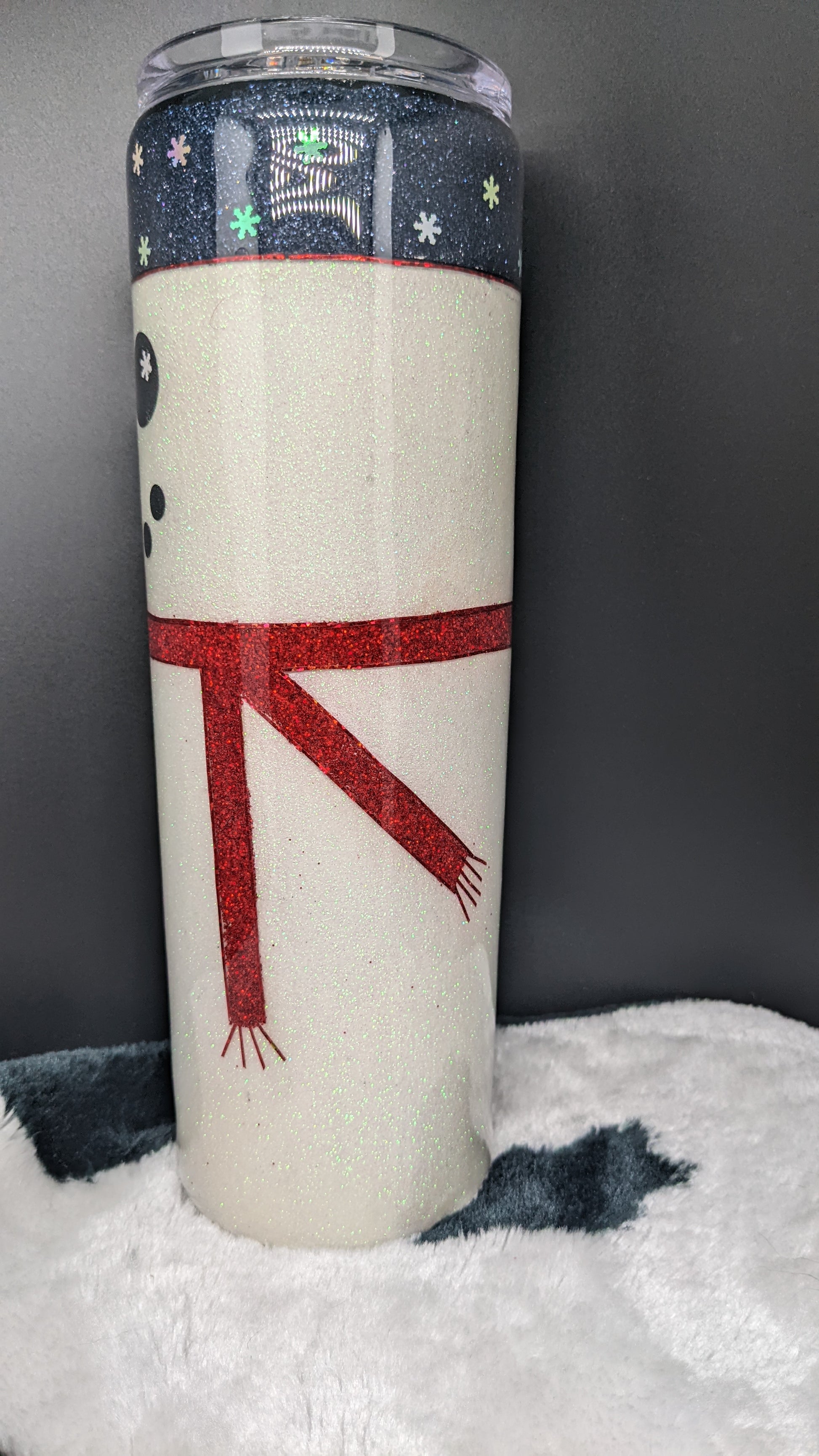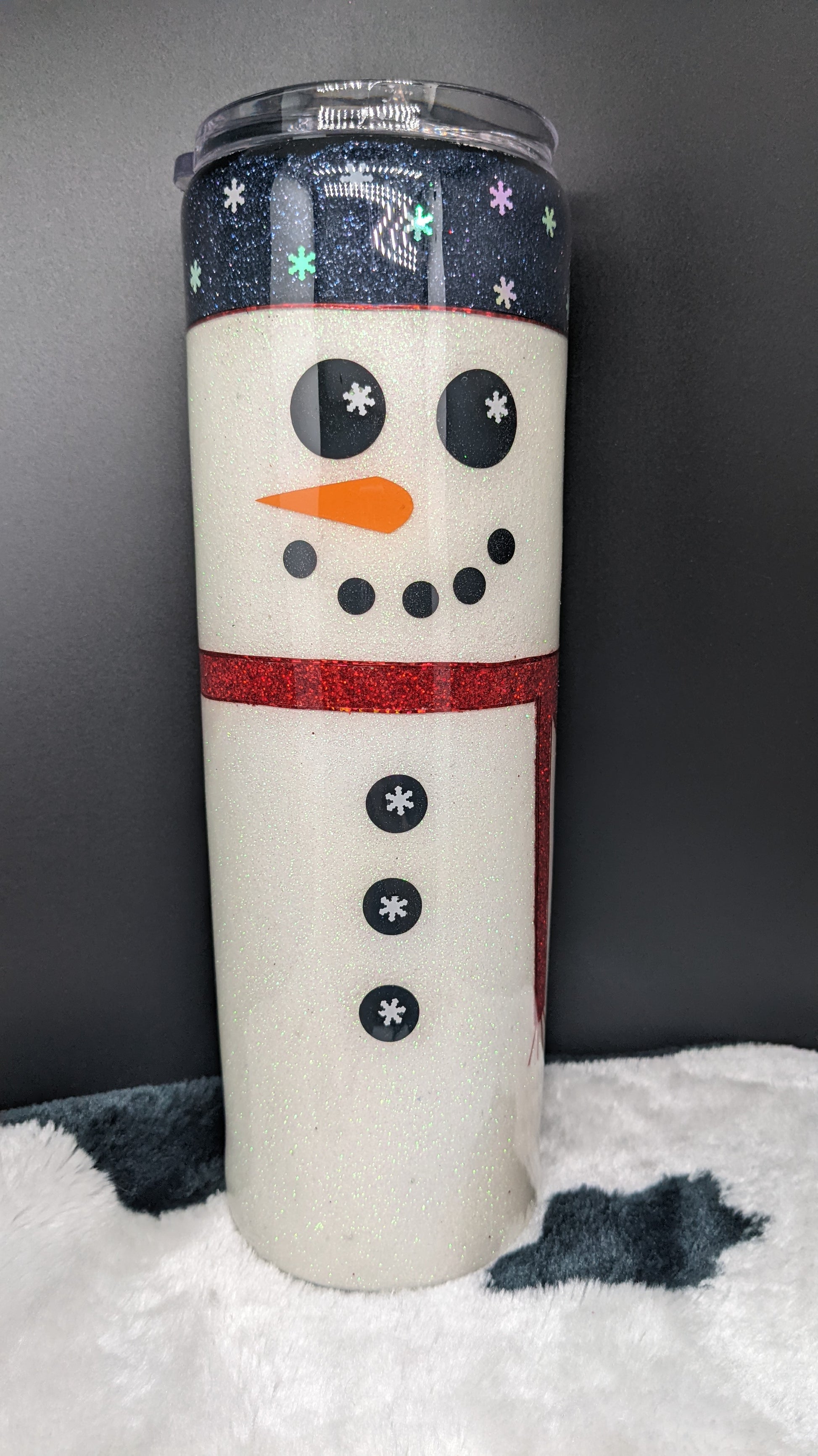 30 oz snowman with red scarf. Stainless steel double insulated epoxy tumbler. Will keep drink hot or cold for extended time.