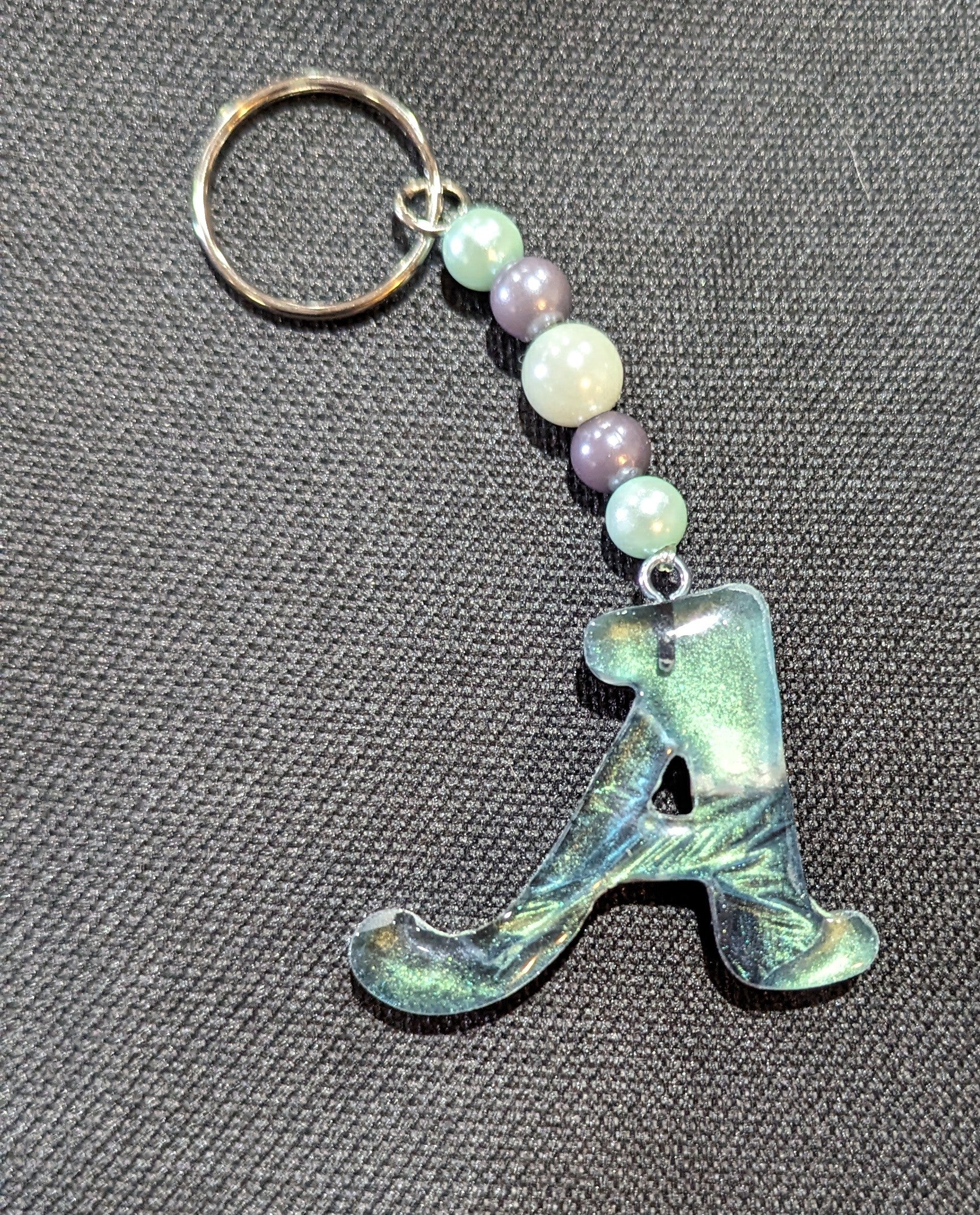 Letter A green swirly epoxy keychain with multi-colored beads and silver ring.