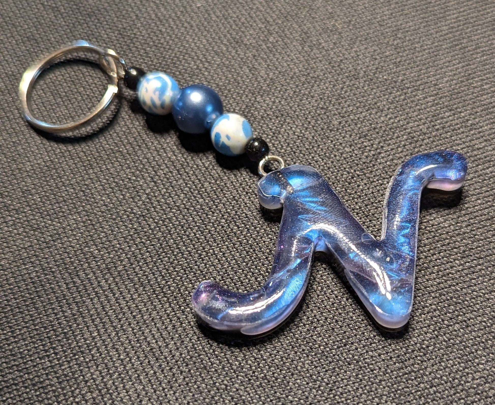 Swirly blue epoxy letter N keychain with multicolored beads and silver keychain.