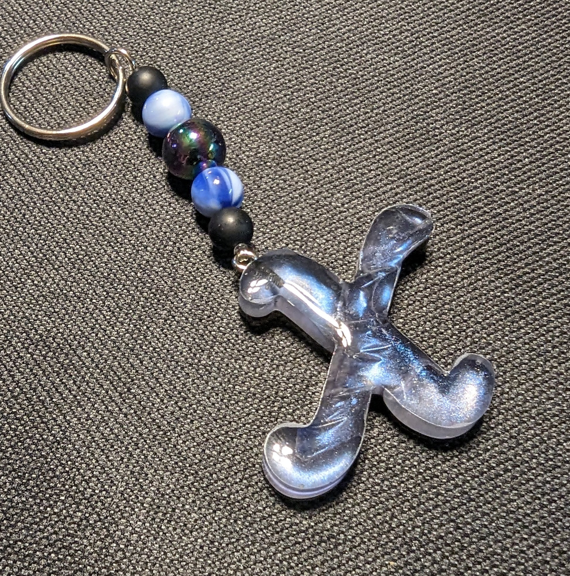 Swirly blue epoxy letter keychain X multicolored beads and silver keychain