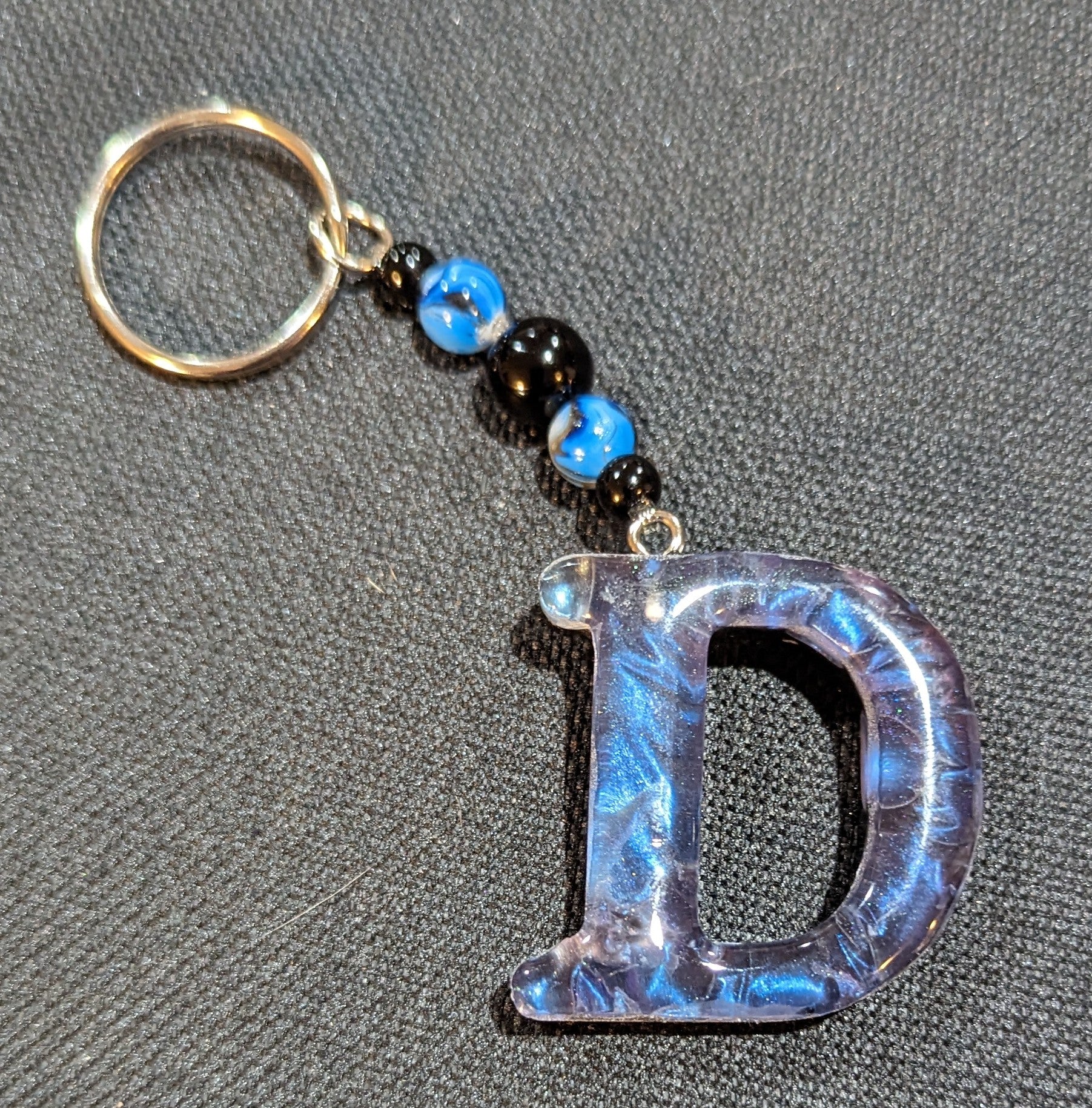 Swirly blue epoxy letter D keychain with multi- colored beaded keychain