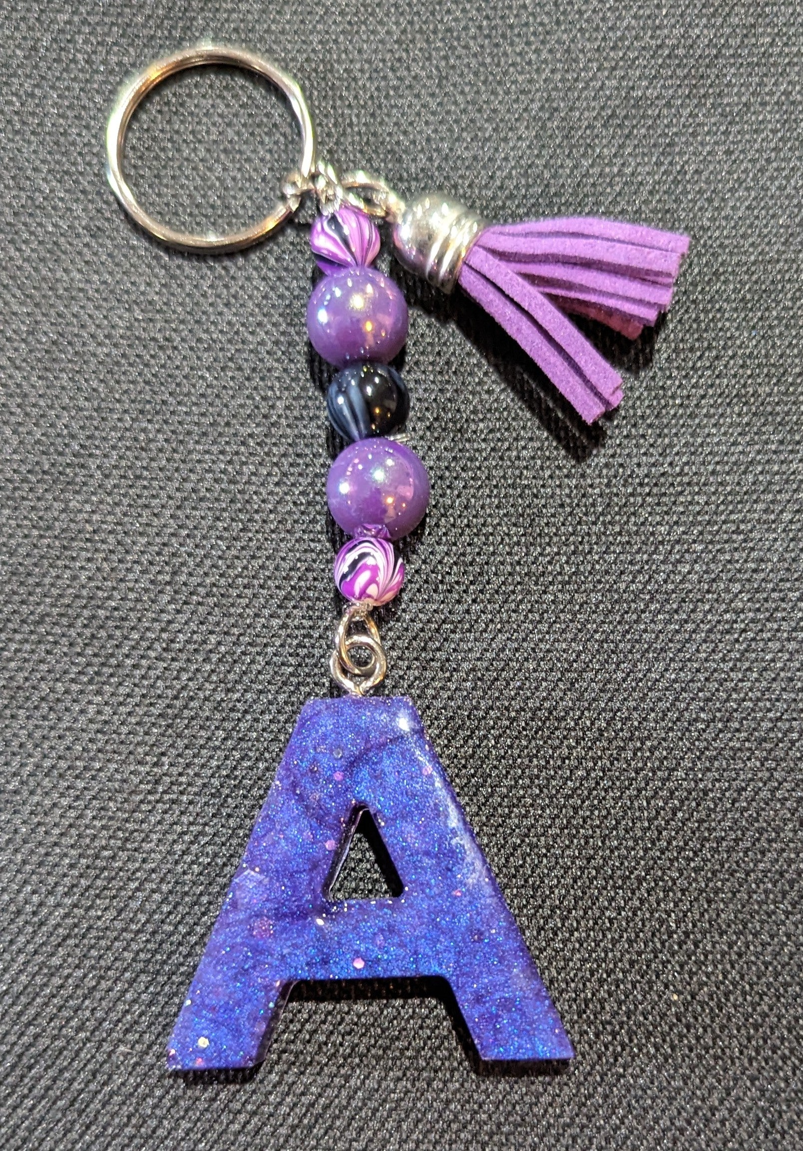 Letter A blueish purple epoxy glitter keychain with beaded chain