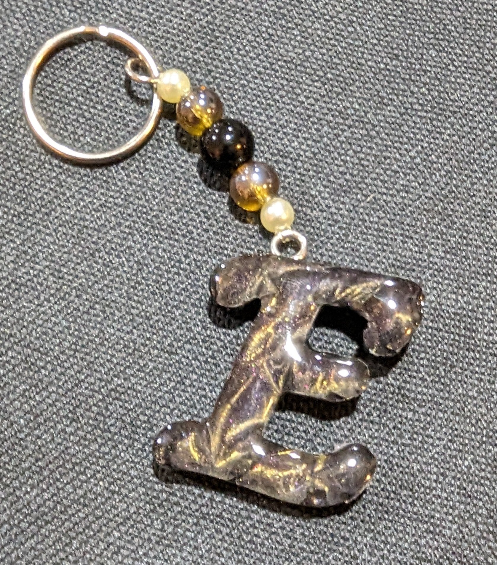 Swirly gold epoxy letter E keychain with multi colored beaded silver keychain
