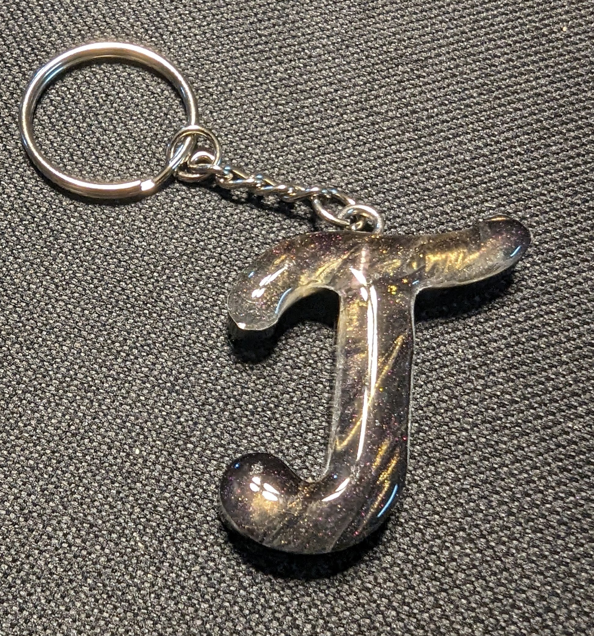 Swirly gold epoxy letter T keychain with simple silver chain.