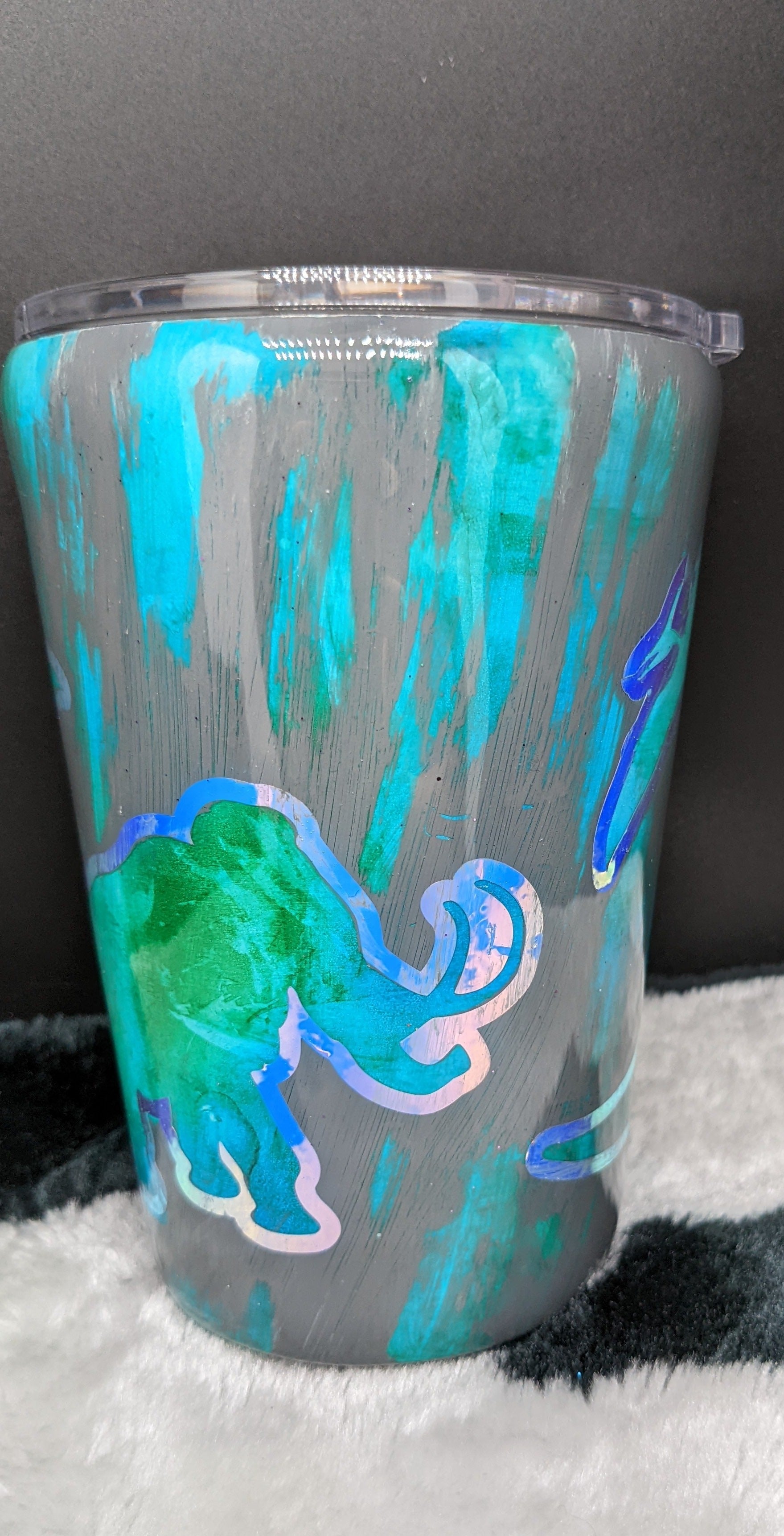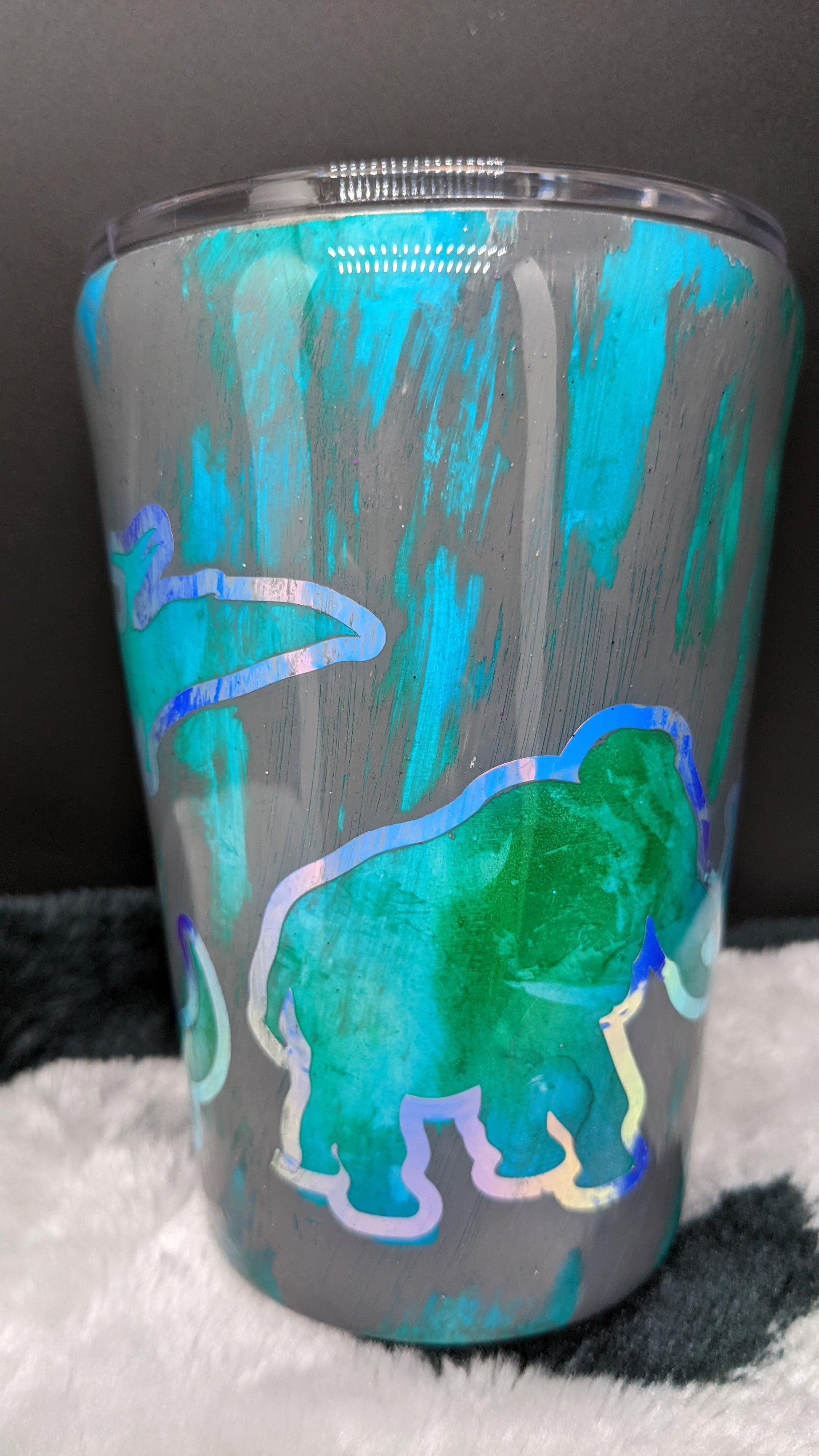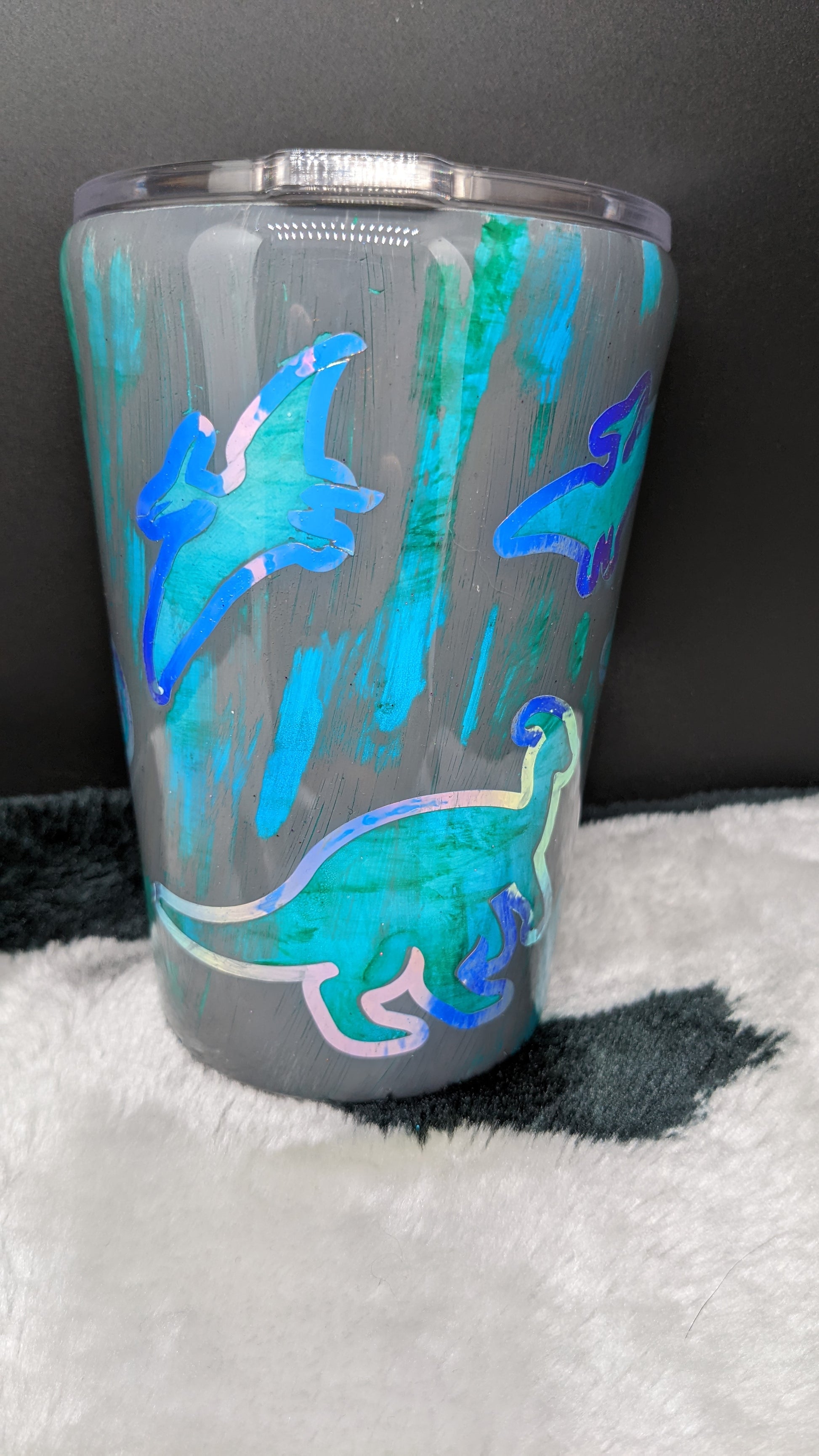 14 oz kids dinosaur stainless steel double vacuumed sealed epoxy tumbler. Will keep drinks hot or cold for extended time.