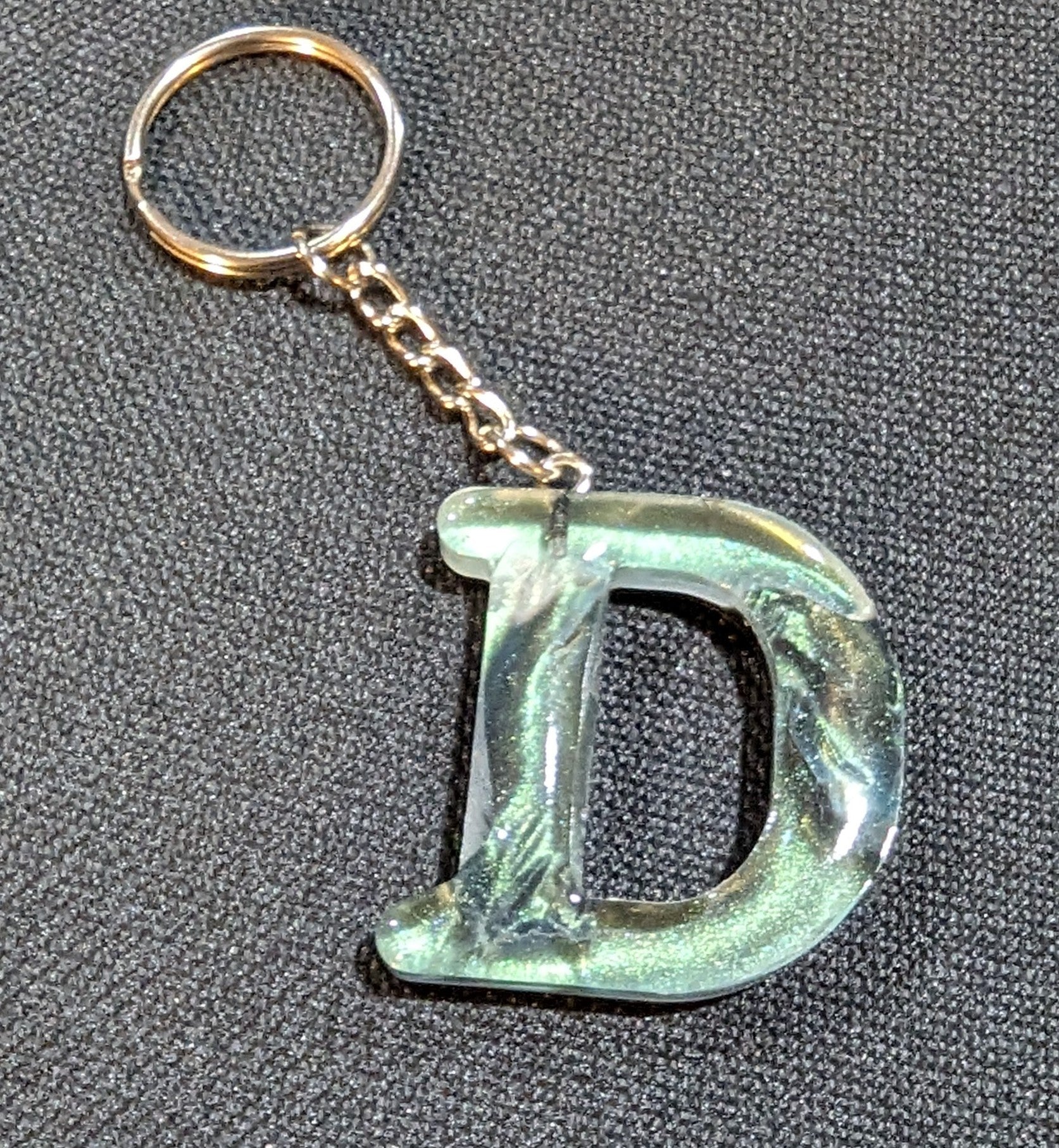 Swirly green letter D epoxy keychain with simple silver keychain