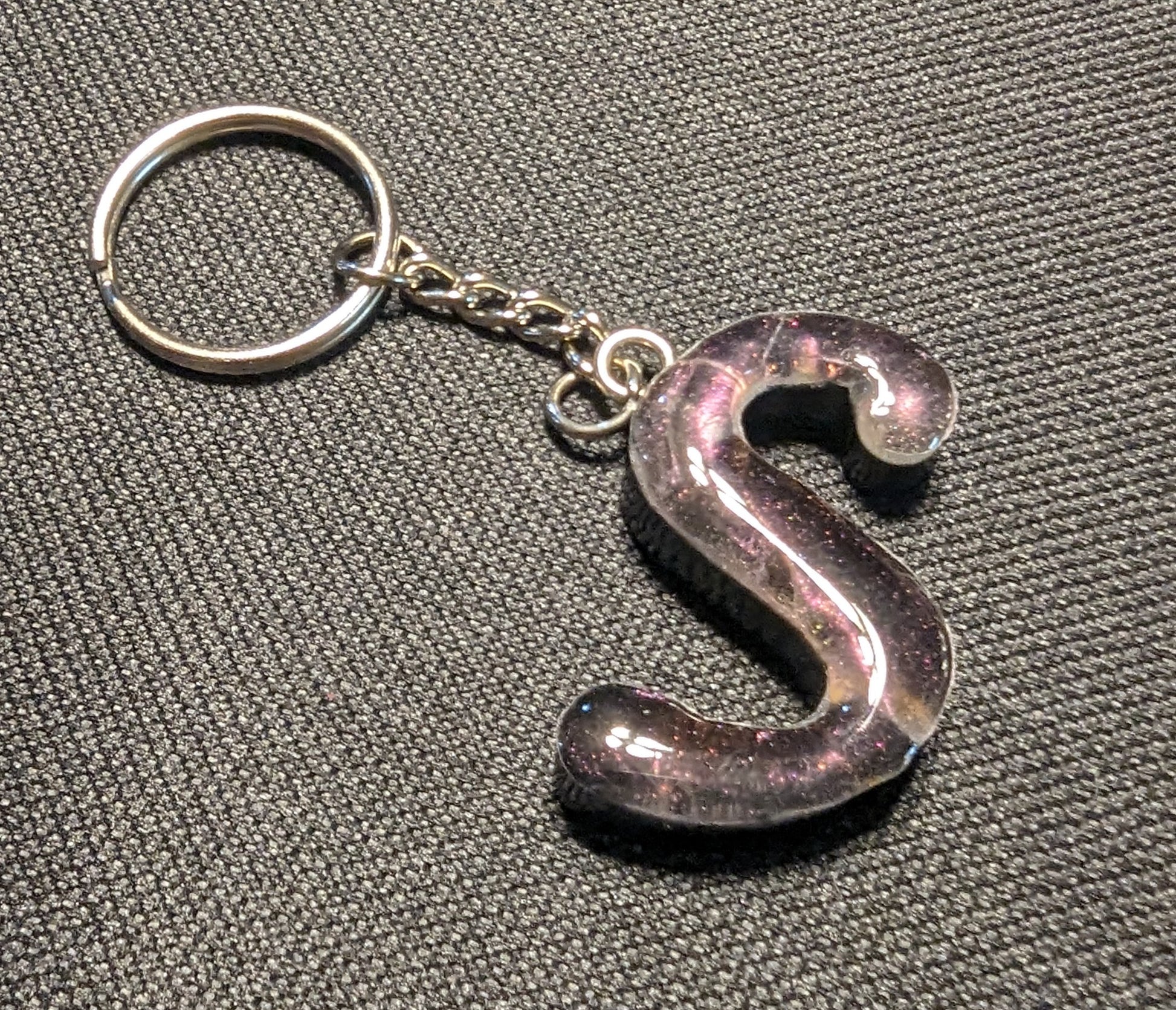 Swirly pink epoxy letter S keychain with simple silver chain.
