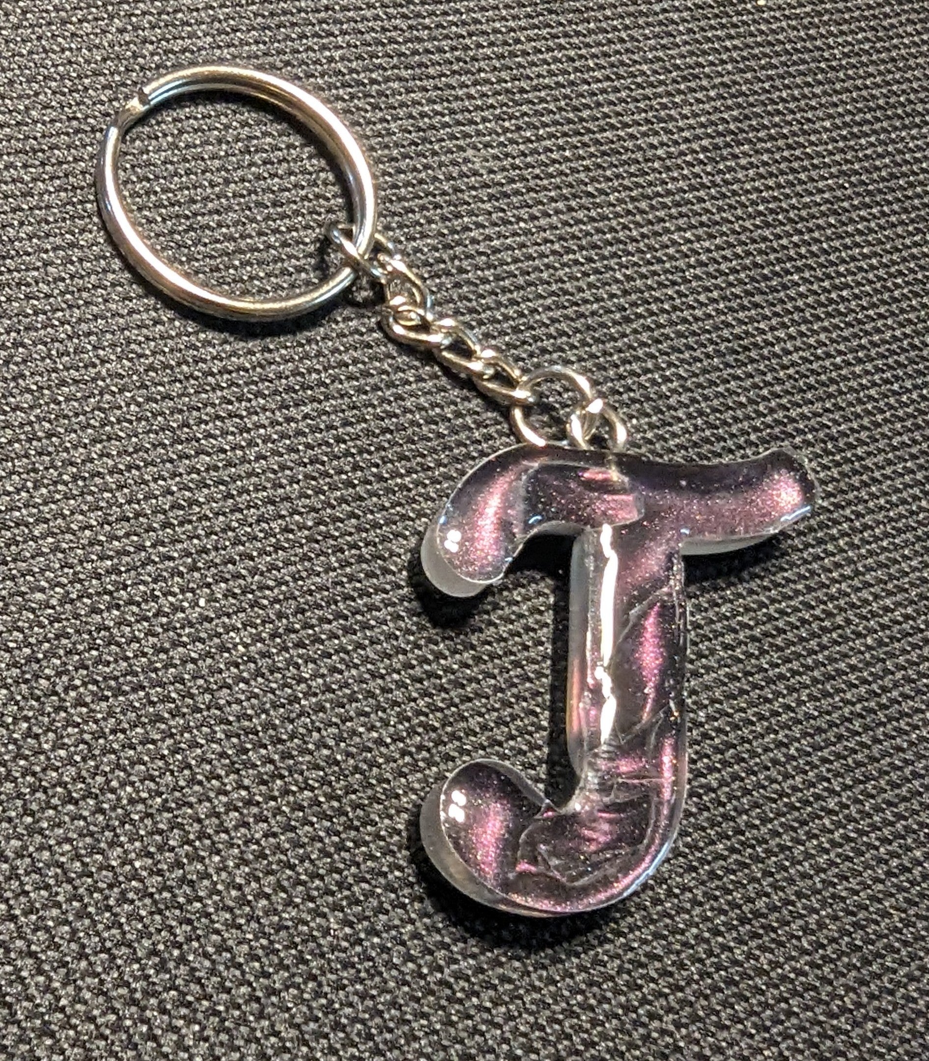 Swirly pink epoxy letter T keychain with simple silver chain.
