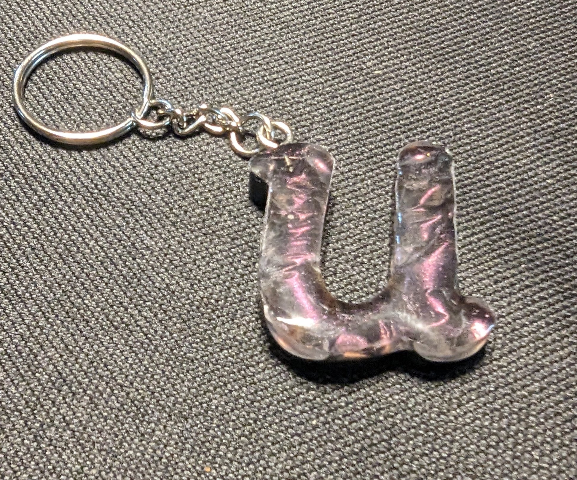 Swirly pink epoxy letter U keychain with simple silver chain.