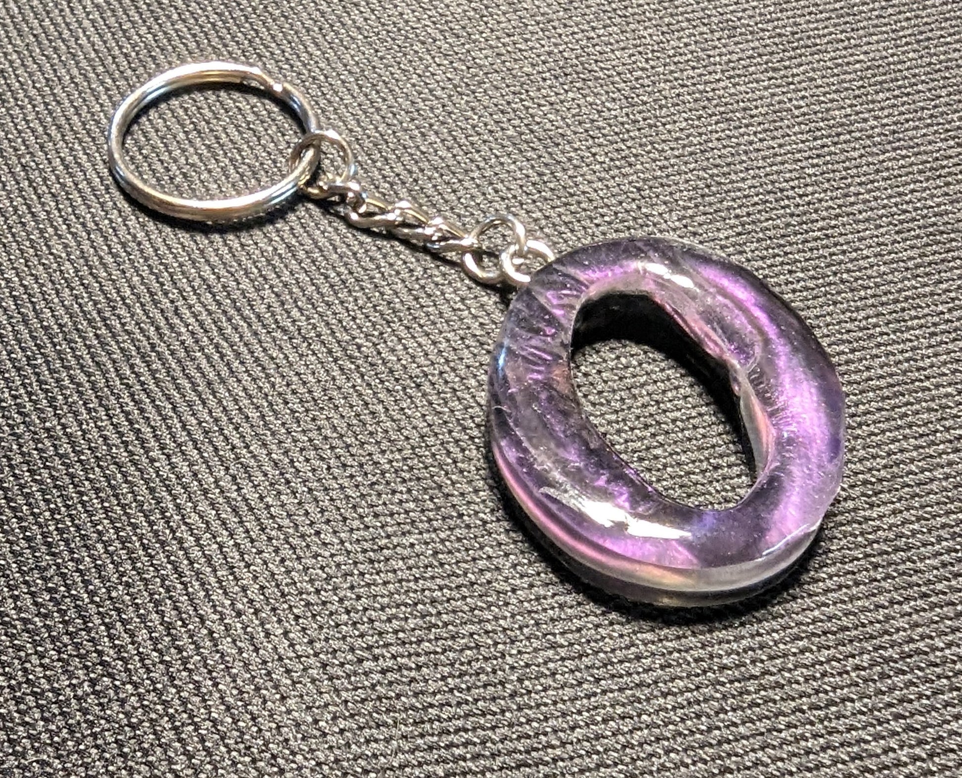 Swirly purple epoxy letter O keychain with simple silver chain.