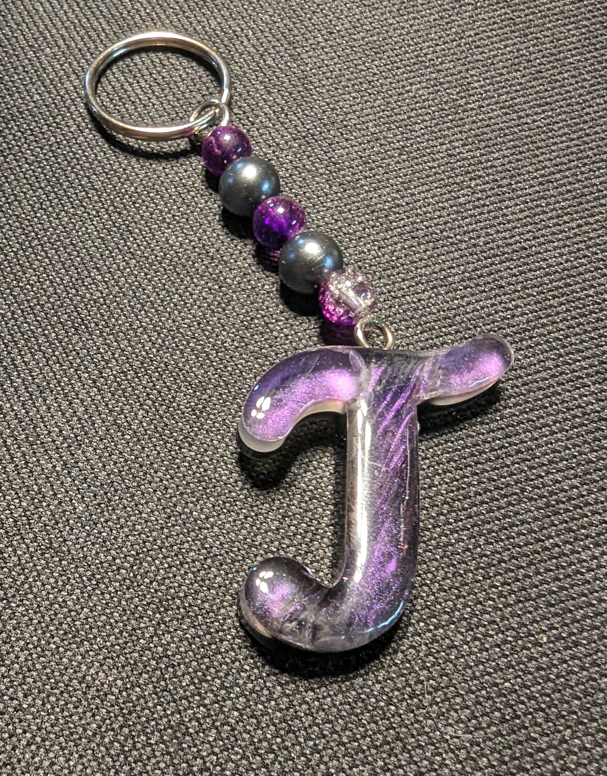 Swirly purple epoxy letter keychain t multicolored beads and silver keychain