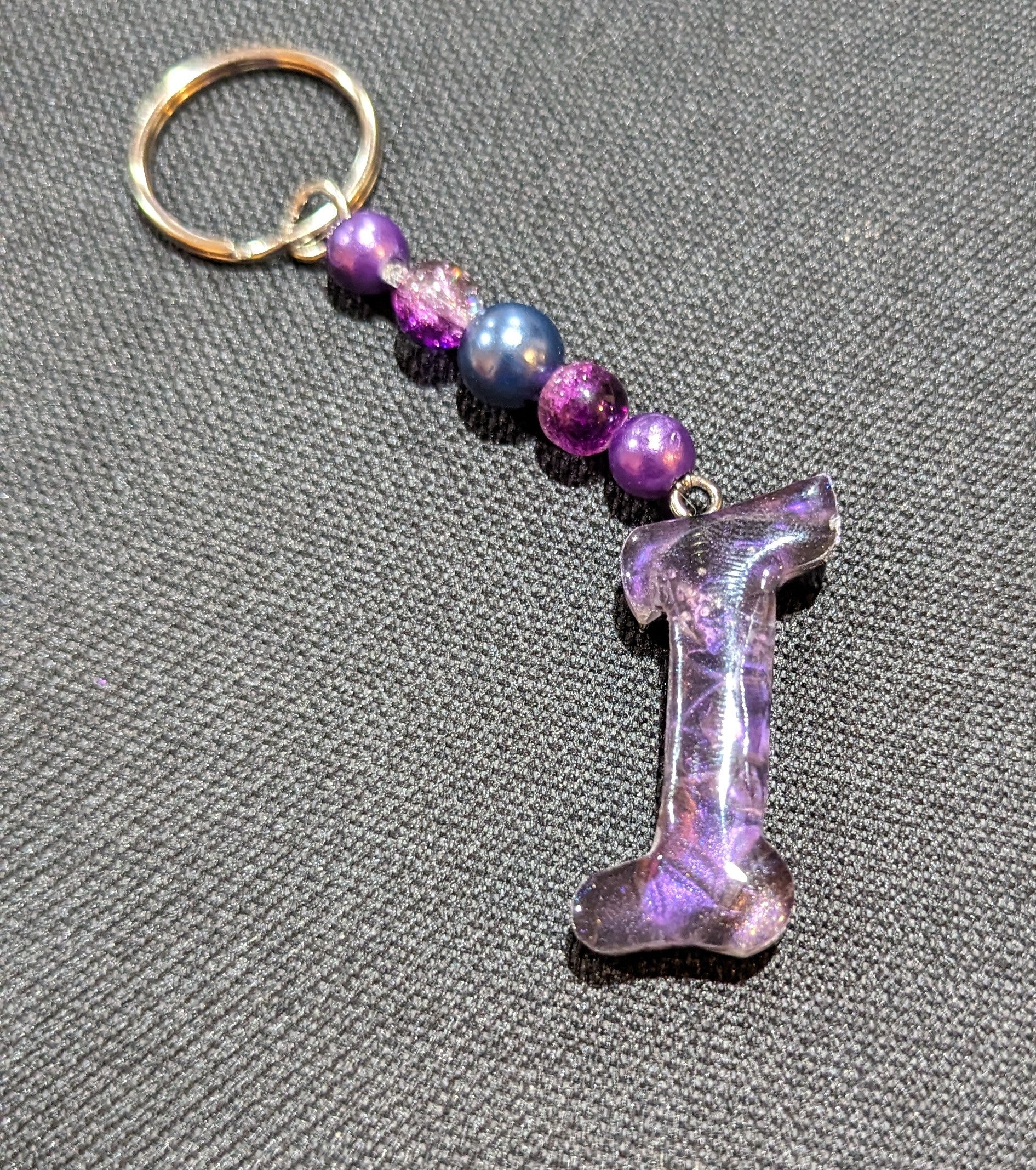 Fancy swirly purple epoxy letter I keychain with multi colored beads on silver keychain