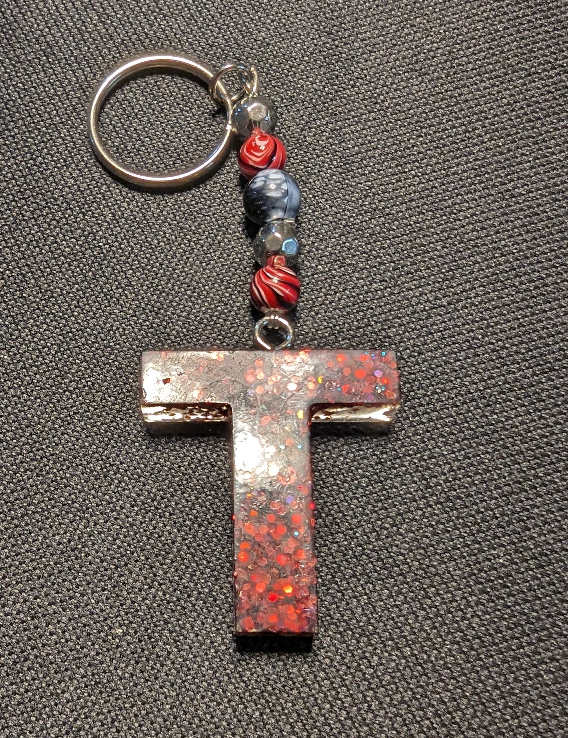 Glitter red epoxy letter keychain T multicolored beads and silver keychain