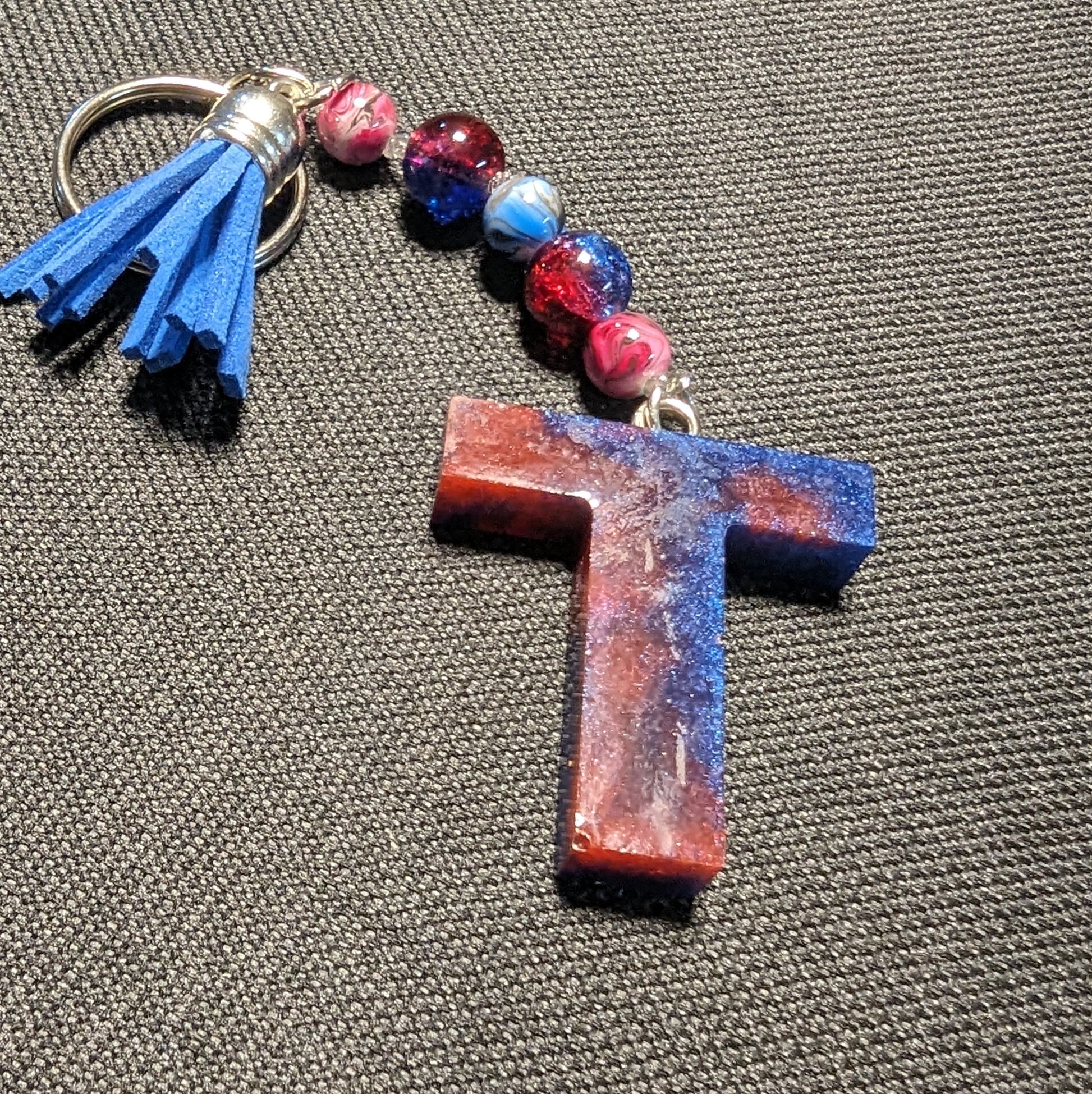 Glitter blue epoxy letter T keychain with multicolored beads, tassel and silver keychain.