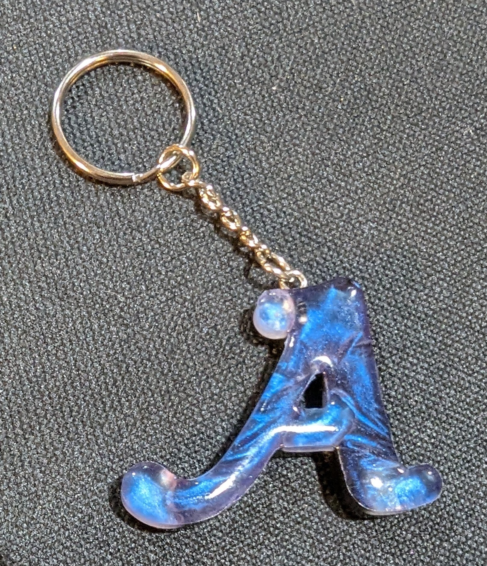 Swirly blue epoxy letter A with a simple silver keychain